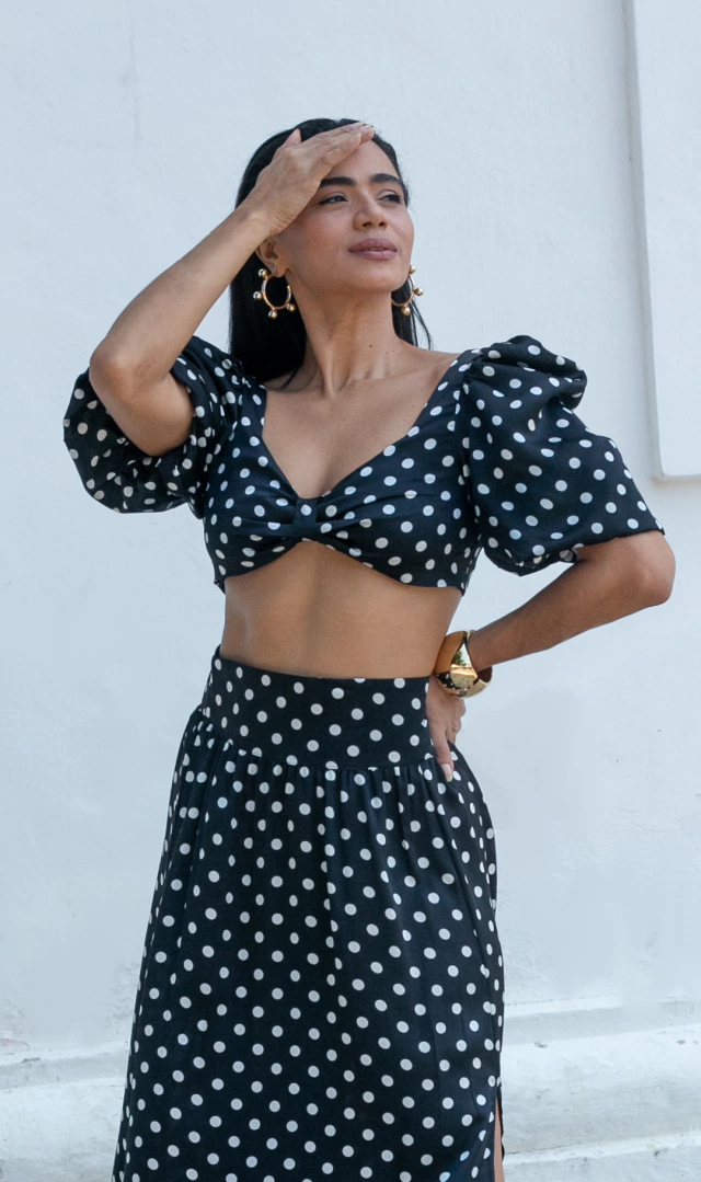 Modelo em crepe acetinado para um toque sofisticado em estampa Polka Dots (poá) para um detalhe divertido